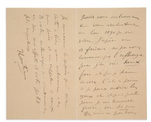 Signed autograph letter addressed to his maternal grandmother S.l., [1890]. 4 pages in-12 in ink (horizontal fold and stains). Signed autograph letter addressed to his maternal grandmother. "...] I can barely open my eyes and for the last four days I have hardly worked, because as soon as I am in position and look at my model, I start crying like a calf. But it's not a problem [...]".