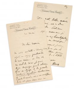 Signed autograph letter to his mother London, May 31, 1892. 3 pages in-8 in ink on "Charing Cross Hotel" letterhead (horizontal folds). Letter in ink addressed to his mother and signed "Yours Henri". "... I am already imbued with the charm and the great regular activity of London... the mother's carriages are a disgrace to many a carriage [...] Our stay being very limited we must be back in Paris on the 10th [...]".