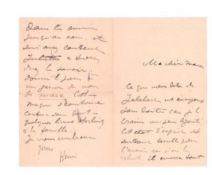 «Ce que vous dites de Jalabert est ennuyeux sans doute car je le crains un peu dégouté. Cet état d'esprit est surtout terrible pour l'avenir car si on le rebute il enverra tout promener. [...] Je suis dans les oeuvres jusqu'au cou et suis assez content [...]».
