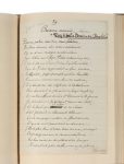 Cellulairement, autograph manuscript of 32 poems, with an unpublished autograph letter from Verlaine to Sivry illustrated with an ORIGINAL DRAWING Brussels, Mons, 1873-1875. 32 autograph handwritten poems by Paul Verlaine on 69 small in-4 pages numbered by him from 1 to 75 on blue-striped school paper (each page is striped with 22 lines). Sometimes Verlaine cut out a part of the page by reworking his text (one half of page 18, to which is added a part of another page; and of page 31; page 36, where two parts are cut out to remove two stanzas). Pages 19, 20, 32-34 are missing; we go directly from page 42 to page 45 with Verlaine's hand (''suite à 42 PV''). All mounted on tabs. Full morocco taupe, back with nerves titled gold, lining decorated with bottle green morocco, moiré guards, slipcase (Marius Michel). Numerous variants on the texts published in Sagesse, Jadis et Naguère, Parallèlement, Invectives, etc. I. To the reader--II. False impression--III. Other--IV. On the waters--V. Lullabies--VI. The Song of Gaspard Hauser--VII. A Pouacre--VIII. Almanac for the past year--IX. Hope glows like a straw--X. Things that sing in the head--XI. Ah, it's really sad...--XII. Kaleidoscope--XIII. Reversibilities--XIV. Images of a penny--XV. Old coppers. The first decade "To charm the pants off you"--XVI. The Choiseul passages with the smells of yesteryear--XVII. Toward Saint Denis....--XVIII. Enough of the Gambettards!...--XIX. Tired! I'm on the Index...--XX. I was born romantic....--XXI. The Wing where I am giving...--XXII. O Belgium...--XXIII. For a year and more I haven't seen the tail...--XXIV. "Let's dam up the streams, the meadows drink enough"--XXV. Poetic Art --XXVI. Via dolorosa--XXVII. Crimen Amoris--XXVIII. Grace--XXIX. Don Juan pipé, - Mystery--XXX. Final Impenitence--XXXI. In love with the devil--XXXII. Final. Attached: - an unpublished autograph letter signed by Paul Verlaine [to his ex-brother-in-law Charles de Sivry], dated February 3 [1881] (4 pages in-8, in brown ink). He asks him to take care of the publication in serial form of certain poems ("L'Impénitence finale", "Don Juan pipé", "Amoureuse du Diable", "La Grâce", "L'Art poétique", and others), tells him that he does not need the copy of Cellulairement made by Sivry or his wife Emma: "Do not send me the copy in question of Cellulairemard [sic]. I have a manuscript here. Didn't I tell you?". He recommends that he correct the proofs himself and especially to remove the title, which would remind him of prison: "Of course remove from everything in his head ... the word Cellularly, absolutely useless and shopping [...]" He instructs him to go and recover certain things in his old apartment, including the manuscript of the Illuminations: "Montmartre nous la... yawns beautifully with his "having nothing at all" of the things in question -- task of rummaging through "ice cabinets" and also the drawer of my ex bedroom and iconic bookcase. It's worth a shot. As for the Enlightenment, you'll find it if you look hard enough." This letter ends with a beautiful self-portrait of Verlaine as a peasant, reading a letter, original drawing in captioned ink (slight tears and folds). In the spring of 1880, he had bought a farm in Juniville in the Ardennes, where he stayed until the spring of 1882. This drawing is reproduced in the catalogue Barthou, l'Album Verlaine de la Pléiade (p. 171) and in Bibliographie et iconographie de Paul Verlaine par Van Bever et Monda (1991, pl. LVIII). - autograph letter signed by Francine Loriot to Madame Jean Cassou (née Ida Jankelevitch). Exceptional copy. PROVENANCE Louis Barthou (ex-libris)
