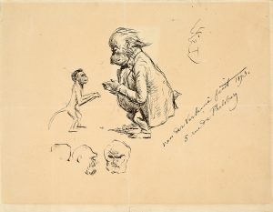 VERLAINE Paul (1844-1896) — Couple de singes et autoportraits simiesques. — Dessin original, avec mention manuscrite à droite : «Van der Verlaine fecit 1893. — 5 rue de Phalsburg». — Encre et plume, 18 x 23 cm.