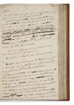Le manuscrit, à l'encre brune au recto de grands feuillets de papier vélin, est surchargé de ratures, corrections et additions (parfois sur des feuillets plus petits ajoutés), et témoigne d'un important travail d'élaboration et de remaniement. Plusieurs versos présentent quelques lignes biffées, correspondant à des débuts de page abandonnés. La pagination, en haut à droite des feuillets, est discontinue, parfois double, avec quelques incohérences (et quelques erreurs lors de la reliure).