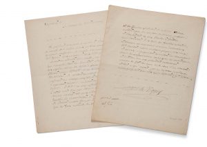 Les Amants de Montmorency, poem, autograph manuscript signed. May 1851. 3 pages in-4, under cover titled "Thème de l'amour impossible et de la mort". This piece of fifty verses corresponds to the central part of the famous poem entitled Les Amants de Montmorency, first published in the Revue des Deux mondes with the subtitle Élévation, dated January 1, 1832. The poem was later reprinted in Poèmes antiques et modernes (1837). The starting point of the story is a news item that occurred on April 29, 1829. A young married man and a young girl committed suicide in an inn room in Montmorency "[...] They had, she said, nothing forgotten. The maid had some trifle which she shows by following their footsteps, step by step. And God? - Such is the century, they didn't think about it [...]".