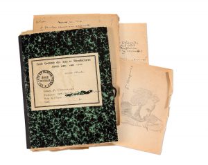 "Jeu des bourrimés" [1941-1943], in a cardboard folder bearing the label of the Ecole Centrale. About thirty folders classified by Vian with a list of the players and rhymes, all with autograph texts in pencil and ink illustrated with some original drawings by François Rostand. Enclosed: "Les Cent Sonnets", 53 typed pages with titled inserts and some corrections by Boris Vian. Published in Cent sonnets.