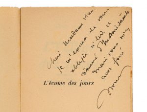 The Foam of Days. Paris, Gallimard, 1947 In-12, paperback. Original edition, no large paper, copy from the press office. Copy of Boris Vian's mother: "Dear Madame Vian. I apologize for forcing you to read this summary of holy history, but you forced me to do so. Boris Vian".