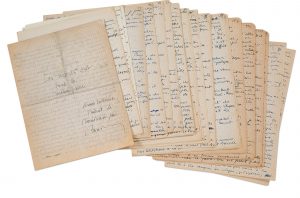 Les Morts ont tous la même peau, autograph manuscript signed 1947, about 140 in-4 leaves in black and blue ink with some corrections. The manuscript is titled "Les Morts ont tous la même peau. Vernon Sullivan translated from the American by Boris Vian". Complete with the famous afterword "Critics, you are calves", 3 pages in blue ink. Les Morts ont tous la même peau will be published in 1947 by Editions du Scorpion under the pseudonym of Vernon Sullivan.