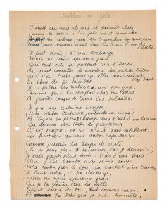 Jelly cantilenas, manuscripts - "Des goûts et des couleurs", 1 page in-12 in ink and typewritten - "Deligny", 1 page ½ in-4 in ink - "Sous le banian", 1 page ½ in-4 in ink and typewritten - "Qu'il y a ?", 2 pages in-12 in ink - "Les araignées", 1 page in-8 in pencil - "Premier amour", 2 pages in-8 in ballpoint pen, signed - "Qu'y a-t-il ?", 1 in-4 page in ink - "Les Frères", 2 in-4 pages in ink and typewritten - "Précisions sur la vie", 2 in-4 pages in ink - "Les Nouvelles", ½ in-4 page in ink - "Les Isles", 1 in-4 page in ballpoint pen, signed - "Les Mers de Chine", 2 in-4 pages in ink - "Ma soeur", 1 page ½ in-4 in ballpoint pen, signed - "Le grand passage", ½ page in-4 in ink and 1 page in-12 - "La vie en rouge", autograph title in ink, and on the back, text in pencil - "A force de les voir", 1 page in-4 in ink, signed - "Monsieur de Bergerac", 1 page in-12 in ink; - "Rue Traversière", 2 pages in-4 in ink - "Bonjour chien", 1 page in-4 in ink, signed and dated "9/12/48" - "Chanson galante", 1 page in-4 in ink - "C'est gentil une licorne", typewritten, 2 pages in-4 with autograph corrections - "La licorne", 1 page ½ in-4 in ink - "Au début la beauté", 1 in-4 page in ink - "Bill of Confession", 4 in-4 pages in ink and pencil - "Declaration", 1 in-4 page in ink, dated "10/5/47" - "Les instanfataux", 1 in-4 page in ink - "Les mains pleines", 1 in-4 page in ink, signed and dated "9/2/48" - "Des goûts et des couleurs", 1 in-4 page in ink. The whole set appeared in Cantilenes in Jelly.