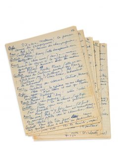 Guiliano, autograph manuscript. 39 pages in-4 in ballpoint pen. A musical comedy project. The action takes place in Sicily in the Alberto Guiliano inn, whose owner is Antonio. The story is burlesque and the text by Boris Vian is a whimsical mix of French and Italian: "Antonio porca Madona! Que vaqueria, qué dirt! Che coneria de pistoleto that it left me solo in the paluchetti! e ché me va perforer le faubourg! Ma, I've got a hole in the loaf of bread where a Napolitani's famiglia turned out to be vermin! Ah, Giuliano! You have sent me a client, but if with each client I puncture the benardo, darling, I'll look like the Madonna della passoira who watches over the budget of the State Frances [...]".