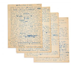 Claire étoile du matin, autograph manuscript. S.d. 26 pages in-4 in blue ink on in-4 grid paper foliated and titled by Boris Vian, an accurate translation by Boris Vian of the American translation of Richard Wright's book. This tragic tale takes place near Memphis during the Segregation era, when a black woman is tormented by the sheriff who is trying to arrest her son Johnny Boy: "[...] Your dirty nigger son is out there somewhere and we intend to find him," says the sheriff. If you tell us where he is and if he talks, maybe he'll get away with it. But if we have to look for him we'll kill him... Something in her burned her, made her perceive the greatness of her victory and her freedom; her heart tried to translate the bitter hours of her life into words in such a way that they realized that what they had done to her was nothing and that she could endure much more [...]".
