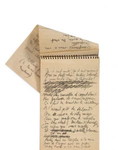 Songbook, autograph manuscripts About twenty in-8 pages in pencil in a brown spiral notebook. "But know that for a hundred years back and forth it's been midnight, let it be noon It was important that it said you piss me off, Dr. Schweitzer".