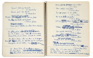 VIAN Boris — Cahier autographe de chansons, manuscrits autographes [1958]. — Environ 90 pages in-4 dans un cahier à spirales vert. — Ébauches et textes de chansons avec notes musicales au crayon et à l'encre dont «Arthur, où t'as mis le...