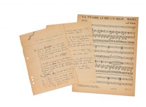 Go cook yourself an egg, man! Words of Boris Vian. Music by Michel Legrand. 1956 Autograph manuscript, 2 pages in-8 perforated in pencil: -Tapuscrit, 1 page in-4 -Tapuscrit of the English version with corrections by Vian, 2 pages in-4: -Printed score.