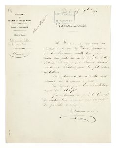 ─ Joint, Rapport établi par l'ingénieur en chef de la Compagnie des Chemins de Fer du Nord adressé à Monsieur DARTOIS, chef su service des aérostiers à la gare de Paris, concernant l'installation des " Poëles provisoires à établir dans la gare de Paris " dans la salle devant servir d'atelier pour la fabrication des ballons. Documents exceptionnels.