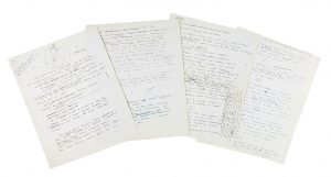 Manuscrit autographe abondamment raturé et corrigé et pourvu de croquis techniques. En tête de la première page est dessiné un petit personnage ressemblant au Petit Prince (5,5 x 5 cm).