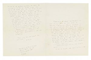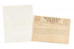 Un télégramme dactylographié envoyé par Saint-Exupéry le 24 août 1939, de New York, à Miss Lawton : « Ai billet pour Chine mais suis obligé aujourd'hui aller retour France cause situation internationale. Stop. Espère vous voir dans quinze jours Las Vegas et vous remercier d'une affection qui m'a tellement aidé. Croyer [sic] mon inaltérable amitié. Saint Exupéry. » (1 p. sur 1 f. de 14,5 x 20,3 cm).