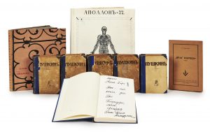 Réunion de livres russes, reliés et brochés, de la bibliothèque de Romain Gary, dont une série de 5 ouvrages imprimés en 1922. Y figure en particulier un exemplaire broché de L'Ennemi du peuple de S. Urasov (1952) que Gary avait rencontré à New York. Il porte l'envoi suivant au faux-titre (traduction) :