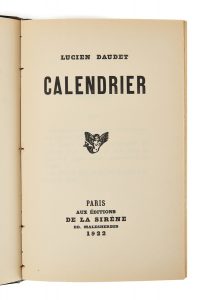 DAUDET (Lucien) — Calendrier. — Paris, Éditions de La Sirène, 1922. — In-12 (18, 5 x 11,5 cm), plats de médium beige vernis, dos lisse à mors apparents avec deux pièces de cuir à motifs tressés imprimés débordant sur les plats, l'une...