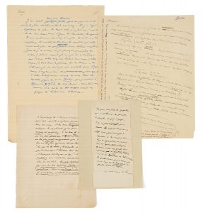- 1 page concernant le roman inachevé Charles Blanchard de son ami Charles Louis-Philippe. 1 p. petit in-4. « Occupé depuis trois jours à rangers les papiers qu'a laissés Philippe et spécialement les 'repentirs' de 'Charles Blanchard' […] ». On joint 2 p. in-4 pour un projet non identifié.
