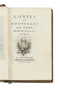 LA FONTAINE (Jean de) — Contes et nouvelles en vers. — Amsterdam [Paris], s. n., 1762. — 2 volumes in-8 (18,8 x 12,1 cm), maroquin à long grain aubergine, sur les plats encadrements de filets simple, pointillé et perlé dorés, dos à nerfs...