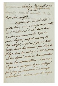 - 3 L. A. S. à Mme Charles Lenormant et 1 L. A. S. en anglais à sa fille Juliette Lenormant datée de 1843. 10 p. in-12, encres brune et noire. La correspondance avec Mme Charles Lenormant est non datée, mais une lettre qui mentionne la parution d'un roman de la comtesse de Boigne chez Michel Lévy permet de la situer en 1867. Mérimée était venu en aide à la comtesse qui était dans la gêne après la mort de son mari en 1859. Une lettre fait allusion à la maison du « pauvre Toqueville » mort cette même année. Juliette est la fille de l'archéologue Charles Lenormant, ami de Mérimée.