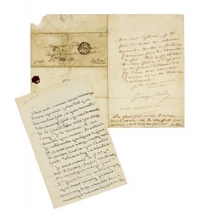- Une L. A. S. adressée à Sylvain Brunet, son domestique au château de Nohant, dans l'Indre. 1 p. in-8. Recommandations pratiques adressées à son domestique. Un post-scriptum écrit de la main d'Alexandre Manceau, secrétaire puis amant de G. Sand, donne les dernières recommandations :