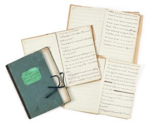 SAND (George) — Manuscrit autographe de "Nanon". — [c. 1872]. — 5 cahiers brochés in-8 (21 x 13 cm) avec titre autographe à l'encre sur le premier plat de chemise de chaque cahier, portefeuille à lacets en demi-toile brune XIXe, étiquette...