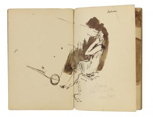 Carnet autographe de Valéry contenant des notes diverses : des calculs d'algèbre, des problèmes de géométrie, des adresses, mots en russe, etc. Ce carnet a surtout fait office de carnet à dessin portatif. On compte environ 24 croquis et esquisses, et une élégante aquarelle (représentant une scène avec un bateau). On y trouve des croquis au crayon représentant un chien, la personne accoudée, une vue à la fenêtre, un petit dessin d'architecture, un personnage allongé les jambes repliées. Une fleur séchée est aussi préservée.