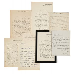 Ensemble hétéroclite de pièces autographes (lettres billets, cartes), la plupart signées, dont 26 du vicomte Georges d'Avenel, historien, 6 d'Eugène Lefèvre-Pontalis, historien de l'architecture et archéologue, 4 de Paul Leroy-Beaulieu, économiste, 4 d'Henry d'Allemagne (dont une avec un petit dessin), historien.