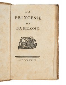 VOLTAIRE (François-Marie Arouet dit) — La Princesse de Babylone. — S. l. n. d. [1768]. — In-8 (21 x 13 cm), cartonnage d'attente de l'époque, étui en demi-maroquin bordeaux. — [2] ff., 182 p.