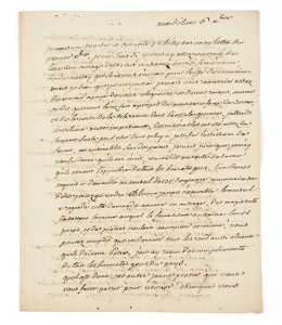 ♦ Précieuse lettre autographe signée « V », adressée à D'Alembert. Il y est question de sujets politiques et philosophiques, notamment du roi Frédéric II de Prusse dont le bilan politique suscite des réserves :