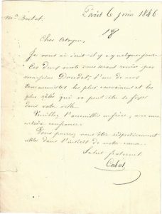 — Au même. Lettre signée. Paris, 22 décembre 1847. Concernant la vente de son journal Le Populaire. L'ouvrier tisseur Eugène Butot, vétéran des luttes de 1830, diffusait le communisme de Cabet à Dijon où il était le correspondant du Populaire.