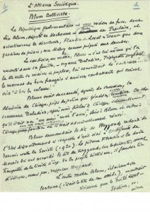 — Manuscrit autographe signé intitulé « L'alliance soviétique. Blum belliciste ». Article paru dans L'Action française du 8 mai 1935 et déplorant la signature du traité franco-soviétique du 2 mai 1935 : « ... En tout cas, le peuple français est averti, par le juif Léon Blum, de la nécessité, qui désormais s'impose à lui, de se faire massacrer pour les bourreaux moscovites. C'est le cas de dire : on mérite ce que l'on supporte. Mais il se peut que le réflexe national joue de nouveau avec vigueur... » (3 pp., dont une sur un feuillet découpé pour l'impression avec coupure de presse collée extraite d'un article de Léon Blum).