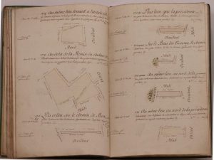 Manuscrit intitulé « Arpentage général des terres labourables, prez et étangs, composant le domaine de la seigneurie de Nanteuil-le-Haudouin. » 1785. 56 ff. in-folio de papier vergé de Hollande, soit 54 ff. manuscrits et les 2 derniers blancs, reliés en un volume de parchemin vert rigide avec pièce de titre en maroquin grenat orné sur le premier plat, vestiges d'attaches, tranches rouges ; volume acquis chez le fournisseur de papier parisien Robert (vignette commerciale gravée sur cuivre) ; dos presque entièrement arraché, mouillures sur le premier plat, coins usagés (Reliure de l'époque). Parcellaire illustré qui servait à préciser un terrier. Chaque parcelle de la seigneurie fait l'objet d'un plan dessiné à l'encre et rehaussé au lavis avec parfois quelques détails arborés et tracés de chemins.