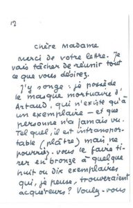 Lettre autographe signée à Raymonde Zajíc-Coupé dite Valentine Fougère. 12 [octobre 1958]. 2 pp. in-16. « ... J'y songe : je possède le masque mortuaire d'Artaud, qui n'existe qu'à un exemplaire – et que personne n'a jamais vu. Tel quel, il est intransportable (plâtre) mais ne pourriez-vous le faire tirer en bronze à quelque huit ou dix exemplaires qui, je pense, trouveraient acquéreurs ? Voulez-vous bien y songer. J'ai trouvé aussi un très beau cliché de Groethuysen [l'écrivain et philosophe Bernard Groethuysen]... Mme Félia Léal..., présidente de l'Union des bibliophiles de l'U.F. a certainement gardé des exemplaires des Hain-Teny (Masson) et des Paroles transparentes (Braque). Je lui écris... » Il s'agit d'ouvrages de deux ouvrages de Jean Paulhan illustrés par André Masson et Georges Braque.
