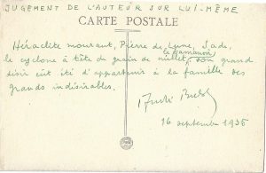 BRETON (André). Carte autographe signée à Paul Éluard. S.l., 16 septembre 1935. 1 p. in-12 oblong ; au verso, …