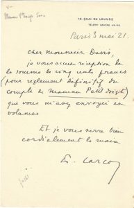 — 29 août et 3 octobre 1921. 2 lettres. Concernant le paiement de ses droits pour Somnambulismes de Jean de Tinan qu'il a préfacé, et pour Les Nymphes de Roger Frêne illustrées par Modigliani dans une édition qu'il a supervisée.