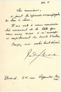Une lettre et une carte autographes signées à Georges Hugnet. Ambrières-le-Grand (Mayenne), 1941. « Chers enfants [il s'adresse également à l'épouse de Georges Hugnet, Germaine Pied], nous rentrons jeudi à Paris. Organisez à "La Vigne d'or" [restaurant voisin du domicile des Hugnet] votre dîner hebdomadaire pour ce jour, mais sans compter sur nous. Nous ne savons pas si nous pourrons y venir. Car nous repartirons peut-être le lendemain matin. Nous espérons vous envoyer un colis en port dû que vous recevrez vendredi ou samedi au plus tard. N'en dites rien à personne. Cela ferait des jaloux. Nous vous embrassons... »