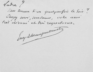 — À madame Howland. Paris, 8 janvier 1884. En-tête imprimé à ses initiales et adresse du 83, rue Dulong. « Je suis obligé de m'absenter demain, et je remets encore la présentation de mon ami Bourget. Dînant avec lui mercredi, je prendrai jour de nouveau. J'ai été désolé de ne pouvoir aller chez vous jeudi soir. Voulez-vous avoir la gracieuseté de me dire quel jour ou quel soir je pourrais avoir l'espoir de rencontrer Madame de Ludre ? Vous trouve-t-on quelquefois le soir ? Croyez-moi, Madame, votre ami très dévoué et très respectueux... » Louise-Marie Delaroche-Laperrière, séparée de son riche mari américain William Edgar Howland, fréquentait les milieux artistiques et littéraires parisiens, Edgar Degas, Eugène Fromentin, Ludovic Halévy, madame Straus, Maupassant, Proust, etc.