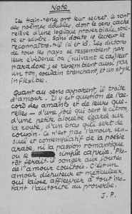 — Lettre autographe signée. 30 mai 1956. « ... J'ai ajouté une phrase (dont je m'aperçois qu'elle était nécessaire au sens). Dites-moi, je vous prie, que je suis un élève docile. Pourquoi cette signature, à la fin de la préface ? Mon nom doit bien se trouver ailleurs. Alors, des initiales suffiraient (J. P.). Est-il même nécessaire de mettre ce titre "Préface" ? On le verra bien, que c'en est une. En épigraphe, pourquoi pas ce proverbe : "Qui se connaît en hain-tenys, il n'est rien qu'il n'obtienne aisément. (Proverbes)."... ». Il évoque également son livre Les Paroles transparentes illustré par Georges Braque, et publié en 1955 par les mêmes Bibliophiles de l'Union française (lettre du 7 mars 1955). De mauvais sujets illustré par Marc Chagall (1958) Manuscrit autographe signé intitulé « De mauvais sujets ». Texte non repris dans l'ouvrage (1 p. 1/2 in-folio).
