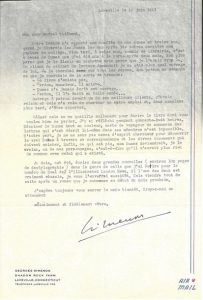 Lettre signée au directeur de la Revue de Paris, Marcel Thiébaut. Lakeville (Connecticut aux États-Unis), 19 juin 1951. 1 p. in-folio dactylographiée. « Votre lettre m'a apporté une bouffée de mes douze et treize ans, quand je dvorais les Dumas les uns après les autres derrière mon pupitre de collège. Plus tard, à seize ans, commis de librairie, c'est à cause de Dumas que j'ai été mis à la porte après deux mois. Non plus parce que je lisais en cachette mais parce je l'avais trop lu. Un client du cabinet de lecture demandait je ne sais plus quel ouvrage de lui. Je le cherchai sur tous les rayons. Mon patron me demanda ce que je cherchais de la sorte et trancha : – Ce livre n'existe pas. – Pardon, Monsieur. Il existe. – Dumas n'a jamais écrit cet ouvrage. – Pardon. Il l'a écrit en telle année... Outrage à patron devant un de ses meilleurs clients. J'avais raison et cela m'a valu de chercher un autre emploi et, deux semaines plus tard, d'être reporter. Hélas ! Cela ne me qualifie nullement pour écrire le livre dont vous voulez bien me parler. J'y ai réfléchi pendant quarante-huit heures. Dessiner le Dumas haut en couleur, sorte de voyageur de commerce des lettres qui s'est décrit lui-même dans ses mémoires m'est impossible. D'autre part, je ne me sens pas assez d'esprit chercheur pour découvrir le vrai Dumas à travers sa correspondance et les divers documents qui doivent exister. Enfin, ce qui est pis, mon Dumas deviendrait, je le crains, un de mes personnages., c'est-à-dire qu'il n'aurait plus rien de commun avec celui qui a existé. Je dois, cet été, écrire deux grandes nouvelles (environ 100 pages de dactylographie) dans le genre de celle que j'ai écrite pour le numéro de Noël de l'Illustrated London News. Si l'une des deux est vraiment réussie, je vous l'enverrai aussitôt. Cela viendra tout de suite après un roman que je commence au début du mois prochain... »