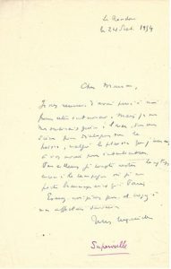 — À son « cher ami ». 1924. « ... Croyez bien que je serai très heureux de vous servir de parrain avec notre commun ami Llona [l'écrivain d'origine péruvienne Victor Llona] pour votre admission au C.L.I [Cercle littéraire international, section française du Pen Club international créé en 1921]... »