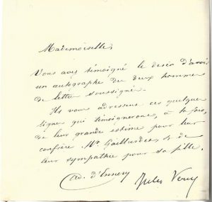 Lettre autographe signée d'Adolphe d'Ennery, contresignée par Jules Verne, adressée à la fille de l'écrivain Frédéric Gaillardet. S.d. 1 p. in-12 carré. « Vous avez témoigné le désir d'avoir un autographe des deux hommes de lettres soussignés. Ils vous adressent ce quelques lignes qui témoigneront, à la fois, de leur grande estime pour leur confrère Mr Gaillardet, & de leur sympathie pour sa fille... ».