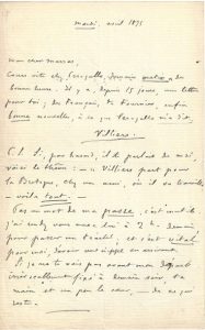 — Lettre autographe signée à Jean Marras. « Mardi. avril 1875 ». « Cours vite chez Peragallo [Léonce Peragallo, agent général de la Société des auteurs dramatiques], demain matin de bonne heure. Il y a, depuis 15 jours, une lettre pour toi... bonne nouvelle, à ce que Peragallo m'a dit... P.S. Si, par hasard, il te parlait de moi, voici le thème : – "Villiers part pour la Bretagne, chez un ami, où il va travailler – voilà tout. Pas un mot de ma passe, c'est inutile. J'ai rendez-vous avec lui à 2 h. demain, pour passer un traité ; et c'est vital pour moi, d'avoir une nippe en arrivant. Si je ne te vois pas avant mon départ, irrévocablement fixé à demain soir, ta main et un peu le cœur, – de ce qui reste. »