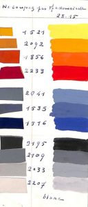 Maquette originale (1946) et 23 gammiers originaux.  Maquette originale préparatoire à la reliure d'un recueil de manuscrits autographes de Louis Aragon pour son livre Hourra l'Oural (1932-1933). Feuillet de papier calque de format 29 x 22 cm, encre rouge, verte et bleue, sur traits de crayon préparatoires. – 23 gammiers de couleurs originaux, à la gouache et parfois au crayon de couleurs, avec légendes autographes, dont 2 garnis en outre de coupons de cuir des couleurs correspondantes ; sur feuillets de papier fort de format environ 10 à 22 x  7 à 11 cm.