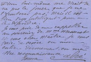 — New York, 1er décembre 1895. « ... Bonne année pour vous et cette chère grande âme qui se nomme madame Massenet. Je pense souvent à elle au milieu de mon exil, et son doux visage était devant mes yeux quand j'allais paraître pour la 1ère fois dans Navarraise ! Henri a dû vous écrire, vous télégraphier nos succès. La 3ème aura lieu mercredi – le public vient. Ça fera de l'argent ici comme partout ailleurs ! Le Cid passera fin janvier ! Je travaille, je travaille : afin que ma Chimène soit digne du grand Massenet ! Je cherche la vérité ! J'y arriverai, je l'espère ! Je me souviens de vos grandes leçons ! Je chante Ophélie ! Marguerite ! Carmen ! Anita ! [respectivement des rôles dans les opéras Hamlet d'Ambroise Thomas, Faust de Charles Gounod, Carmen de Georges Bizet et La Navarraise de Jules Massenet]. Je plais en blonde comme en brune. Ils sont si charmants ces Américains ! que j'en arrive à croire que je possède l'âme blanche de mes douces héroïnes, et l'âme rouge de mes brunes héroïques ! C'est amusant, le travail ! Il n'y a que ça pour faire oublier la vie !... » S.l.n.d. « Votre dépêche me ravit. Moi qui avais si peur que vous ne vouliez pas de moi pour Manon ! Je sais bien ! Je ne suis pas la femme du rôle ! Cela m'enflamme davantage ! La difficulté vaincue ! C'est ça qui va être intéressant ! Autour de moi tous mes amis américains se réjouissent ! Vous pouvez avoir en Amérique avec Manon le pendant de Carmen, m'a dit l'un d'eux, et il a raison. Je deviendrai la femme du rôle. Je pioche, je travaille, et je me fais... maigrir ! Je serai grande mais pas forte, je vous le jure !...»