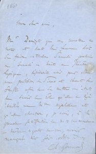 — Rome, 22 novembre 1868 : « ... Quand vous verrez Gevaert à l'Opéra, je vous prie de lui recommander de faire observer le passage très important du très long point d'arrêt, après la mort de Valentin, avant le chœur très lent "que le Seigneur ait son âme..." [à la fin de la septième scène du IVe acte de Faust, qui allait être créé en février 1869 à l'Opéra de Paris où le compositeur François Auguste Gevaert était directeur de la musique] » Les autres lettres concernent notamment la partition pour piano et chant de Faust, la traduction italienne de cet opéra (« c'est honteux, honteux ! »), son séjour à Naples en 1862, ses œuvres Les Deux reines de France, Mireille, Prière du soir, Le Crucifix, Philémon et Baucis, Le Tribut de Zamora, Georges Bizet, le librettiste Jules Barbier.