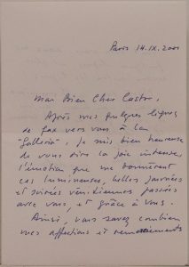 Ensemble d'environ 270 lettres et cartes à Castor Seibel. 1998-2017 et s.d. Importante correspondance amicale, où sont souvent abordés des sujets musicaux et artistiques, par exemple les œuvres de Jean Fautrier. La pianiste Madeleine Lioux épousa d'abord Roland Malraux, le demi-frère d'André, qui mourut en déportation en lui laissant un enfant. Dans l'immédiat après-guerre, elle vécut avec André Malraux, lui-même en deuil de la compagne qui lui avait donné deux enfants : ils se marièrent en 1948 et demeurèrent en ménage jusqu'à leur séparation au début des années 1960.