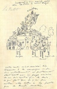 Ensemble de 12 lettres et pièces. Opéra Garnier : Le Petit (Alfred). Lettre autographe signée, illustrée d'un dessin original, [probablement adressée au directeur du périodique satirique Le Grelot]. [1875]. Envoi de sa caricature, intitulée « Inauguration du nouvel Opéra avec la statue de Richard Wagner » : il représente le compositeur coiffé d'un casque à pointe, assis sur l'Alsace-Lorraine au sommet du nouveau bâtiment, encensé par quatre hommes politiques français également coiffés de casques à pointe (encre et plume avec traits de construction au crayon, 120 x 105 mm).
