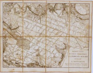 Réduction du tableau topographique de la forest de Senart, présentée à Monsieur pour le service de ses chasses et promenades… [1777 ?]. Carte gravée, 43 x 33 cm, montée sur toile rose pâle et repliée, étui de papier rose, large roulette dorée en encadrement sur les plats, étiquette de papier bleu canard avec titre doré Forest de Senart sur le premier plat (étui de l’époque). Belle carte gravée.