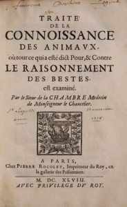 Traité de la connoissance des animaux… Paris, Pierre Rocolet, 1648. In-4, 17,5 x 22,7 cm, 4 ff., 30 pp., 5 ff., 388 pp. (mal chiffrées 390), vélin souple ivoire (reliure de l’époque). Édition originale.